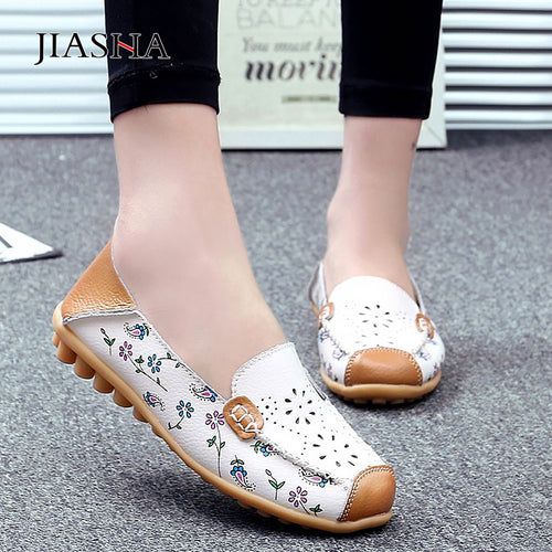 Genuine leather shoes woman fashion summer hollo breathable print casual women shoes slip on ballet flat shoes women sandals