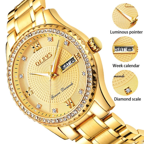 Genuine OLEVS Mens Gold Watches Luxury Quartz Diamond Watch Auto Calendar Display Men Full Steel Wrist Watch relogio masculino